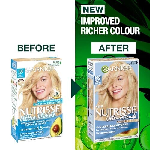 • Experience salon-quality color with Garnier Nutrisse, delivering vibrant, ultra-light blonde results.