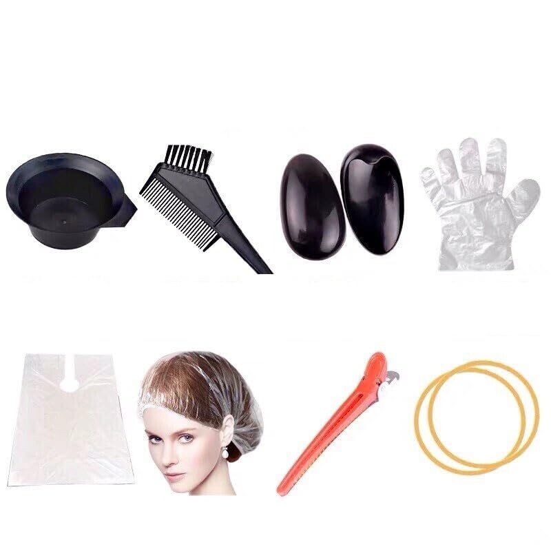 collapsible dye bowl, ear covers, gloves, comb, hair clips, shower cap, small elastics, and a protective cape. Materials are plastic designed for durability and repeated use. The brush and comb have ergonomic, long-handled designs for easy holding and precise color application. The set is suitable for both DIY home use and professional salon settings, and tools are designed for easy cleaning—dye bowl wipes clean and brush rinses thoroughly under warm water.