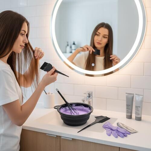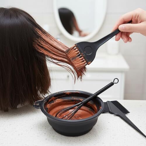 Professional-grade hair dye kit for salon or home use. Includes foldable silicone bowl, flexible dye brush, precise dye comb, and dye mixer. Compact, portable, easy to clean, durable, and reusable—designed for smooth color distribution and versatile styling at home or in the salon.