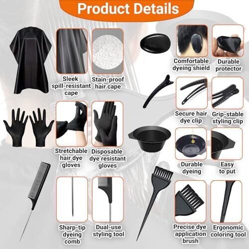 - Includes essential tools: 2 mixing bowls, 3 types of brushes, 1 comb applicator, 4 sectioning clips, a protective black cape, and gloves.