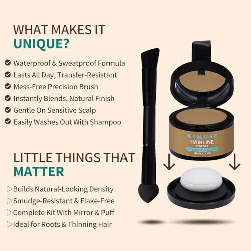 Kimuse Hairline Powder instantly conceals hair loss and thinning at the hairline for a natural look. Dual-ended brush blends powder into scalp, with transfer-proof and sweat-proof formula for all-day coverage on the go.