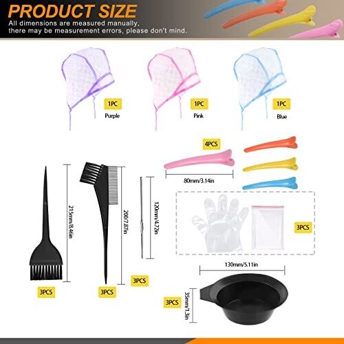 The product comprises 22 pieces in total, including 3 hair coloring caps, 3 crochet hooks, 3 hair dyeing angled combs, 3 hair dyeing brushes, 3 disposable hair dyeing shawls with gloves, 3 hair dyeing bowls, and 4 hair clips. The kit is made of high-quality plastic, providing lightweight durability, ease of cleaning, and reusability for continued use. Hair coloring caps are designed to fit most head sizes with clearly marked sizing circles for placement guidance. The included dye brushes and mixing bowls are shaped to distribute color evenly across various hair lengths and textures. This set is intended for DIY hair dyeing suitable for all hair types and styles, enabling salon-quality results at home.