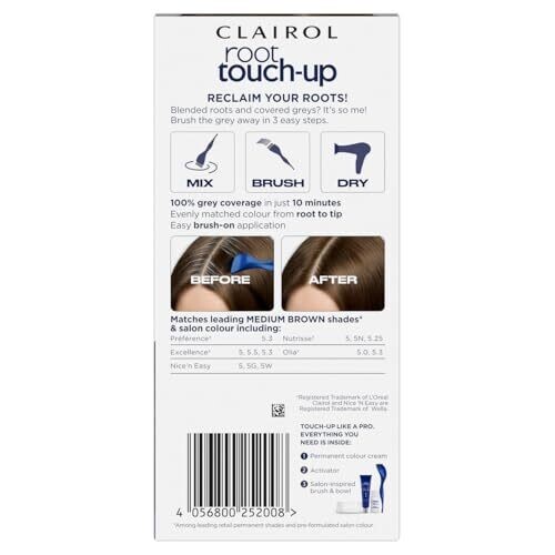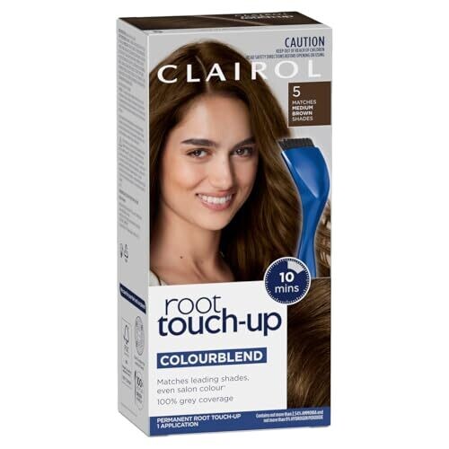 Clairol Root Touch Up 5 Medium Brown delivers salon-like color at home. This permanent root color blends with your shade, provides 100 percent grey coverage, and features a precise brush for quick, fade-resistant, 10-minute application.