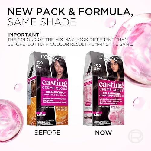 L’Oréal Paris Casting Crème Gloss Semi-Permanent Hair Colour – shade 200 Ebony Black. Ammonia-free formulation. Contains Glycolic Gloss Complex and Glycolic Acid, which colors while conditioning. Provides grey coverage. Longevity stated up to 32 washes. Claims include enhanced glossiness and longwear color.