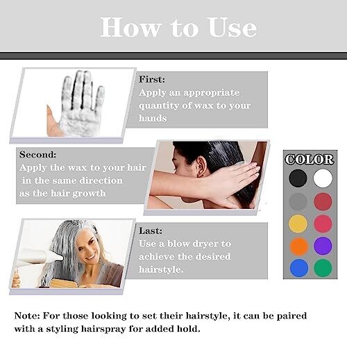Long-lasting temporary hair color with quick-dry formula; does not leave wax residue after drying; non-sticky finish; non-toxic and non-allergenic ingredients safe for hair and skin; easily removable with regular shampoo and water; suitable for daily wear, cosplay, festivals, parties, clubs, Halloween, and fancy dress; 10 color options including black, white, gray, red, pink, yellow, green, blue, orange, and purple.