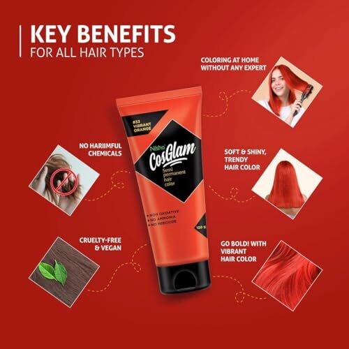 • Discover vibrant, salon-quality color at home with Nisha Cosglam Semi-Permanent Hair Color in Vibrant Orange.