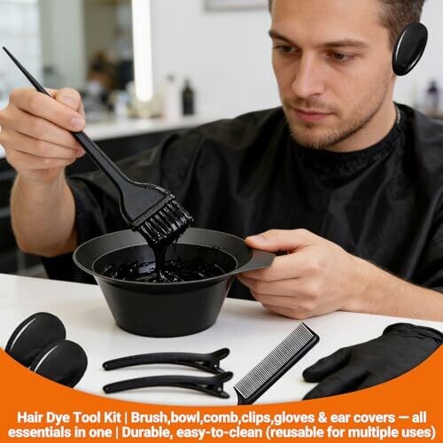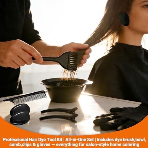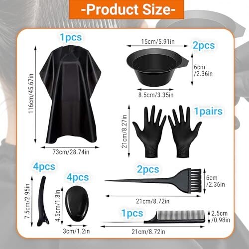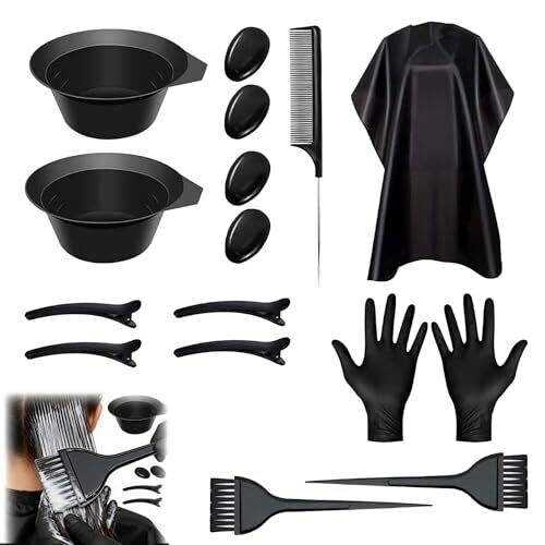 - Includes essential tools: 2 mixing bowls, 3 types of brushes, 1 comb applicator, 4 sectioning clips, a protective black cape, and gloves.