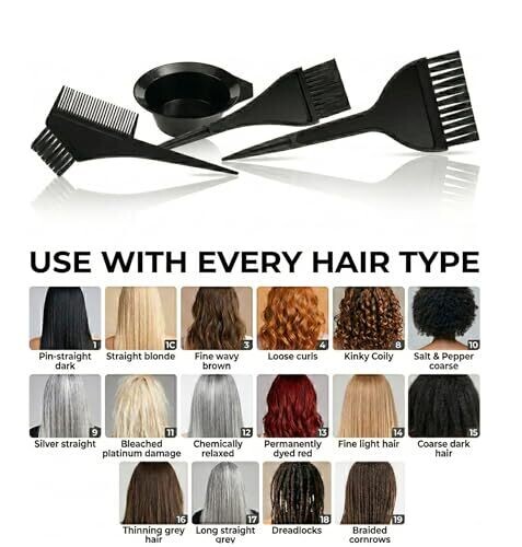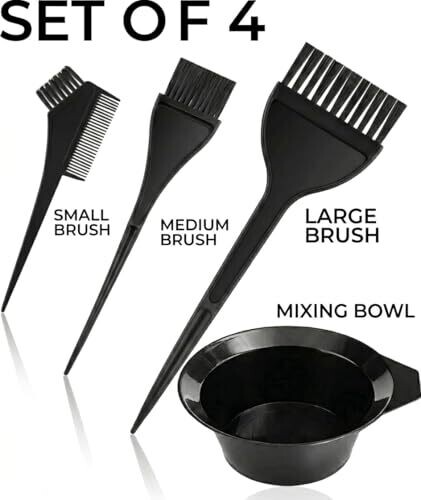 • Includes a mixing bowl, 1 large brush, 1 small brush, and a hair dye comb‑brush for versatile application.
