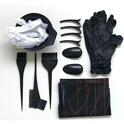 All-in-one hair dye kit for professional-looking at-home color. Includes 22 pieces to cover dyeing, mixing, and application tasks. Durable, lightweight plastic tools easy to clean and reuse. Ergonomic brushes for precise color application, stylish black design.