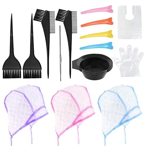 The product comprises 22 pieces in total, including 3 hair coloring caps, 3 crochet hooks, 3 hair dyeing angled combs, 3 hair dyeing brushes, 3 disposable hair dyeing shawls with gloves, 3 hair dyeing bowls, and 4 hair clips. The kit is made of high-quality plastic, providing lightweight durability, ease of cleaning, and reusability for continued use. Hair coloring caps are designed to fit most head sizes with clearly marked sizing circles for placement guidance. The included dye brushes and mixing bowls are shaped to distribute color evenly across various hair lengths and textures. This set is intended for DIY hair dyeing suitable for all hair types and styles, enabling salon-quality results at home.