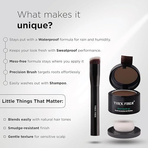 Instantly conceals thinning hairlines and gray roots for a fuller look. Includes puff, mirror, and precision brush for easy application. Water- and sweat-resistant formula that stays put during daily activities. Provides natural-looking coverage for hair loss, bald spots, and part lines.