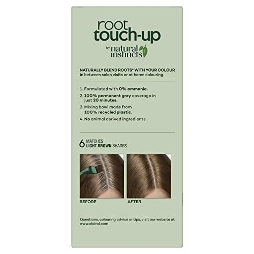 Clairol Root Touch Up Natural Instincts 6 light brown delivers seamless root coverage between salon visits with naturally blended roots and 100 percent grey coverage. Quick 20-minute color development, zero ammonia, and lasting permanent colour.
