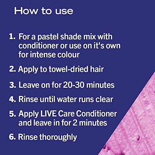 Semi-permanent hair dye. For bleached blonde to light brown hair. Colour cream only to achieve an intense colour. Add conditioner to create a pastel shade or your own new colour. Lasts up to 15 washes.
