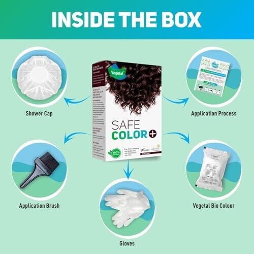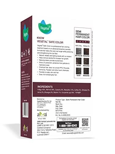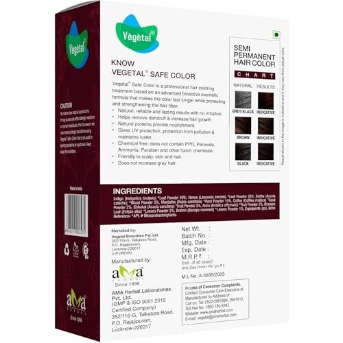 Vegetal Safe Hair Color is a semi-permanent dye formulated with natural herbal extracts; contains no ammonia, PPD, parabens, or peroxide; provides UV protection against environmental pollutants; designed to be friendly to hair, scalp, and skin, delivering natural color with maximum grey coverage; includes an application kit comprising powder color, shower cap, colouring brush, and gloves.