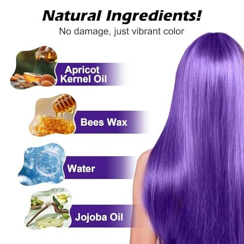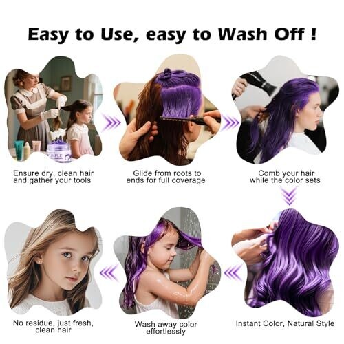 Bold purple color pops on dark hair with no harsh processing. Instant, washable, non-permanent—apply, style, and rinse with regular shampoo. Ideal for teens and adults at cosplay, parties, masquerades, Halloween, or nightlife with smooth clay texture for easy coverage.